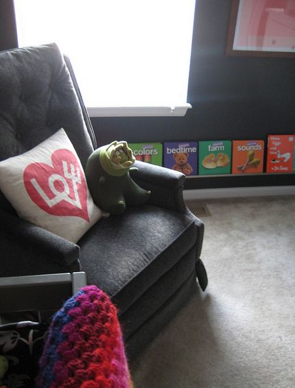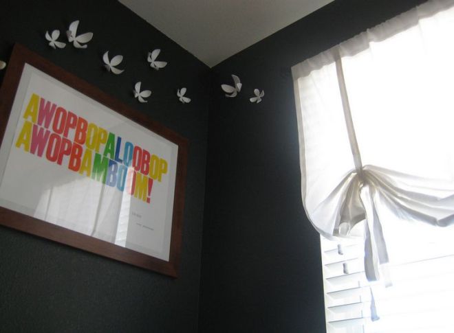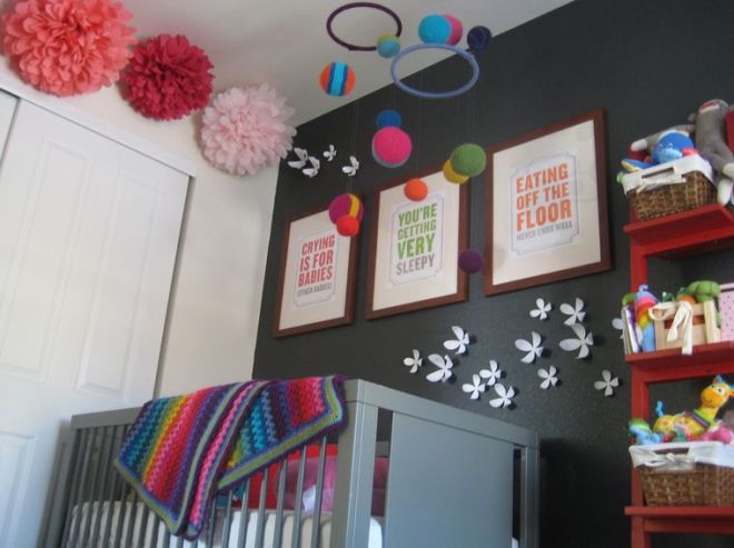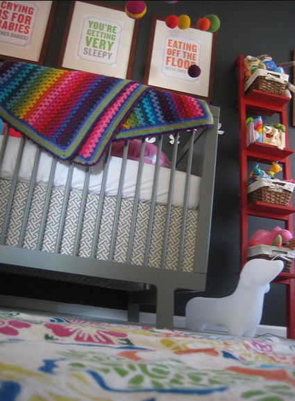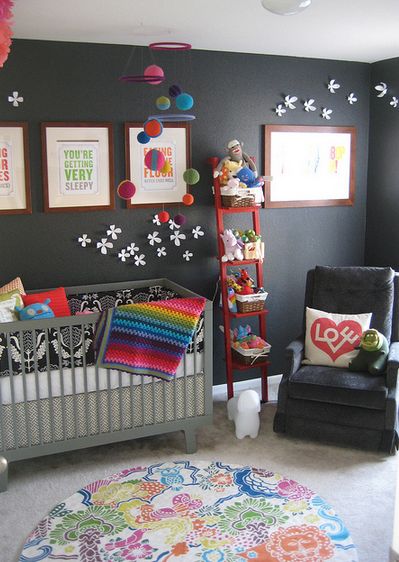 PEDIG… Íme egy szerintem fantasztikus példa arra, hogy mennyire vidám, barátságos és meghitt környezetet lehet teremteni a fekete használatával is. Engem teljesen lenyűgözött ez a szoba, amelyet a texasi Michele Watson álmodott meg és váltott valóra kisbabája számára. A takarókat és a színes labdás függőt ő maga készítette, meg is lehet vásárolni ezeket a boltjában.