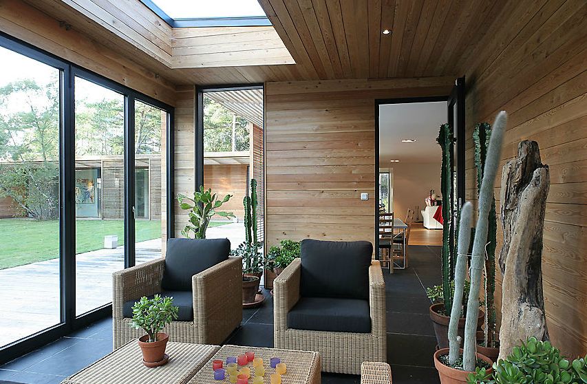 Az ajtókat és üvegfelületeket tologatni lehet, illetve akár “össze is hajtogatni”, ez különösen a ház sarkában beszélgetésre, pihenésre szolgáló, illetve egyfajta télikertként is működő helyiségnél figyelhető meg jól.