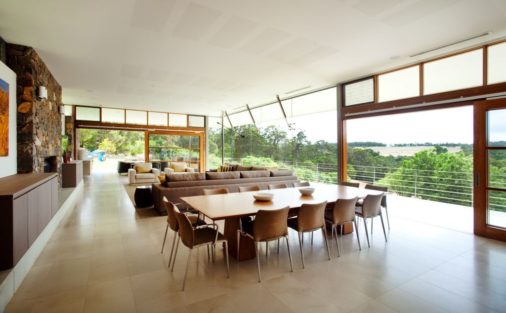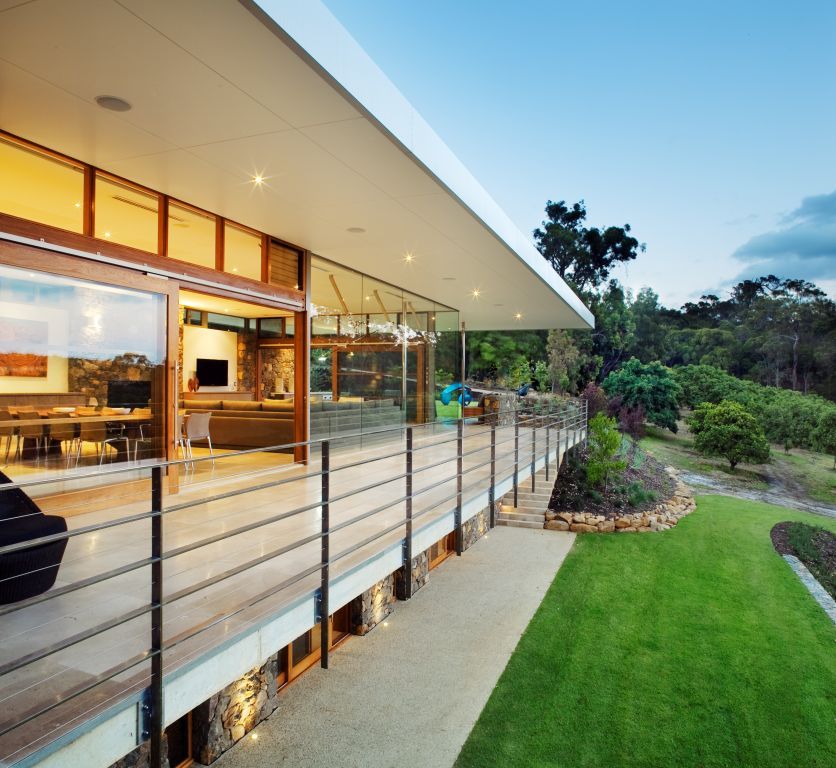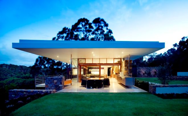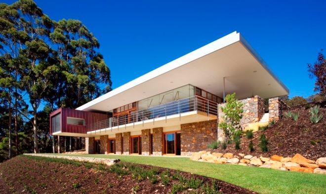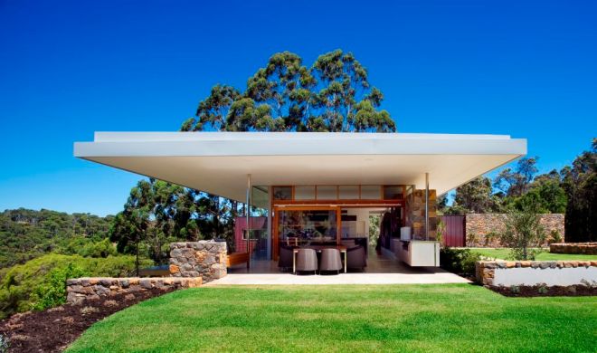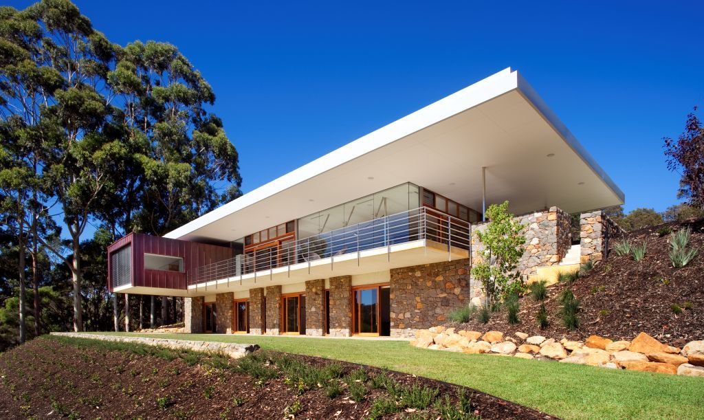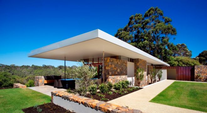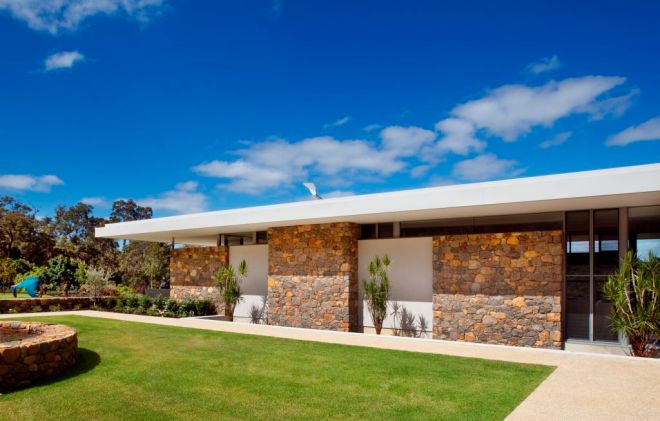 Tim Wright és Rachel Feldhusen alapította 1996-ban a wrightfeldhusen építészirodát, az ő munkájuk gyümölcse ez a dél-nyugat Ausztráliában található épület, amiben nekem a terméskő falak tetszenek különösen, és az általuk határolt belső kertrész, amire egy magyar ingatlanos biztos az “intim” szót használná. 😉
