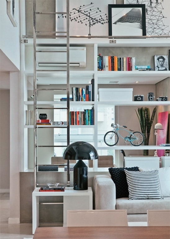 Egy 5 méter belmagasságú lakásban a padlótól a plafonig érő könyvespolchoz nem csodálom, hogy kell a létra, bár abban biztos vagyok, hogy ebben a kecóban nem a háziasszony áll neki hetente leporolni a polcokon lévő tárgyakat. 😉 Nekünk A Férjjel porallergiánk van, úgyhogy kizárt, hogy ilyen polcunk lehessen, nálunk minden üveg mögött van.