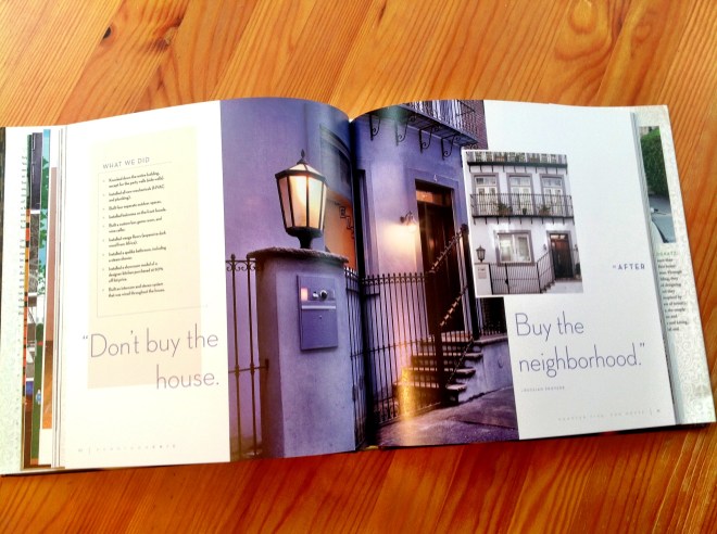 A könyvben számtalan fotóval illusztrálják, hogy miből mit varázsoltak, és közben jól nyomon követhető a stílusuk fokozatos tisztulása is. Pofonegyszerűnek tűnő, de ennek ellenére, vagy talán éppen ezért nagyon megszívlelendő, a saját élettapasztalataikkal (kudarcaikkal és sikereikkel) alátámasztott tanácsaik vannak arra vonatkozóan, hogy milyen romot szabad megvenni és milyet nem, hogy milyen városrészt érdemes választani, hogy mitől lesz izgalmas, egyedi, ugyanakkor személyes egy lakás berendezése, hogy milyen trükökkel érdemes bolhapiacokon kincsekre vadászni (volt, hogy elhoztak egy francia piacról egy hatalmas, régi templomi rózsaablakot, ami egy manhattani lakás nappalijának dísze lett…), vagy hogy milyen szempontokra figyelj, ha olyan házat rendezel be, amit utána ki akarsz adni idegeneknek, hogy csak néhány példát mondjak.