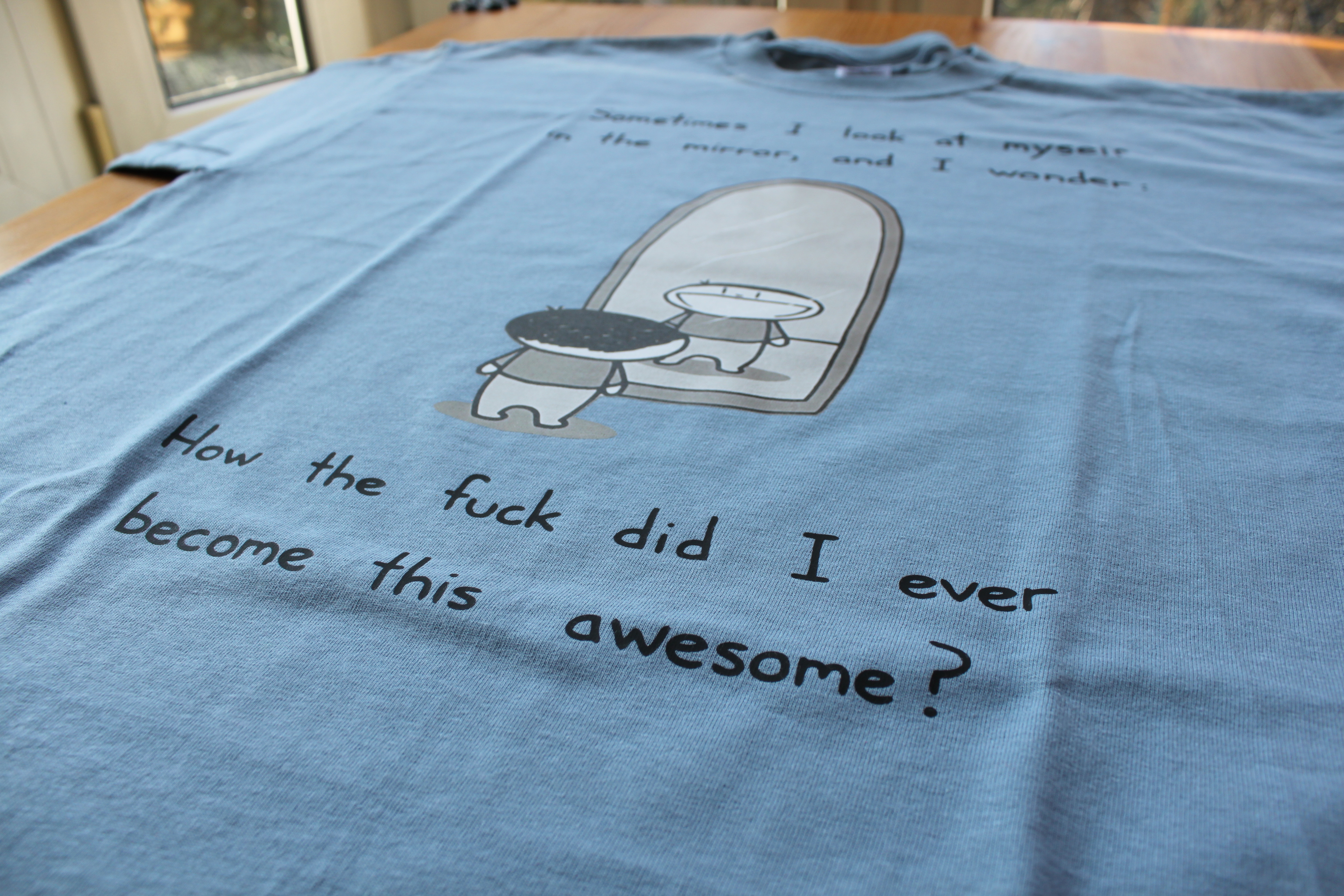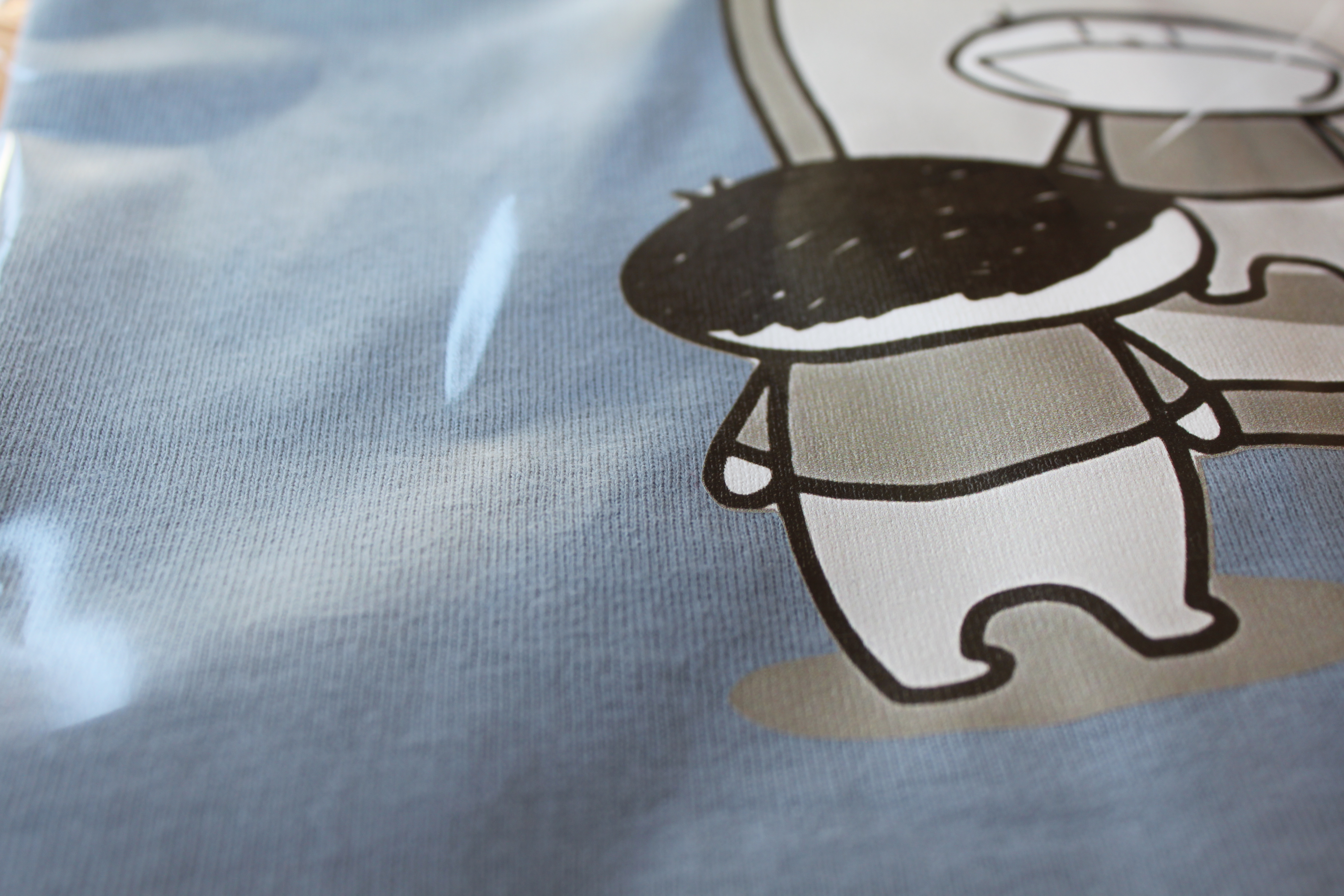 Mivel ugye csak csütörtök este szóltunk, és pénteken már tele voltak más munkákkal, a POLOboxos Kolos László az egész szombat délelőttjét bent töltötte a boltban, hogy az esti szülinapra kész legyenek a pólók – annak ellenére, hogy szombaton nem is dolgoznak… Nem számított, hogy túl kis felbontású képeket küldtünk és hogy volt, olyan kép, amin egy szót ki akartunk cserélni (amihez ugye szerkeszteni kellett a teljes képet) – márpedig ezek miatt egy csomót kellett vacakolnia velük, ahelyett, hogy mondjuk a végre gyönyörű napsütésben sétált volna egyet. Mivel tudta, hogy fontos nekünk, hogy hosszú legyen a póló, és mondta, hogy az egyes darabok között akár 4 cm különbség is lehet, nekiállt, és az XL-es raktárkészletet egyenként átválogatta, hogy megtalálja a 3 leghosszabb darabot… Közben pedig vagy 10x beszélt velünk telefonon, hogy a felmerült kérdéseket tisztázzuk és mindenképp tökéletes verziók szülessenek. Persze mindez a szolgálatkészség nem számítana túl sokat, ha silány minőséget kaptunk volna, de nem. A pólók gyönyörűek lettek, az egyiket közelről is végigfotóztam, hogy lássátok. Baromi jó az anyaguk, jó lett a rájuk nyomtatott képek felbontása, és még szépen be is lettek csomagolva. Majd mindezek után nem volt hajlandó borravalót elfogadni…