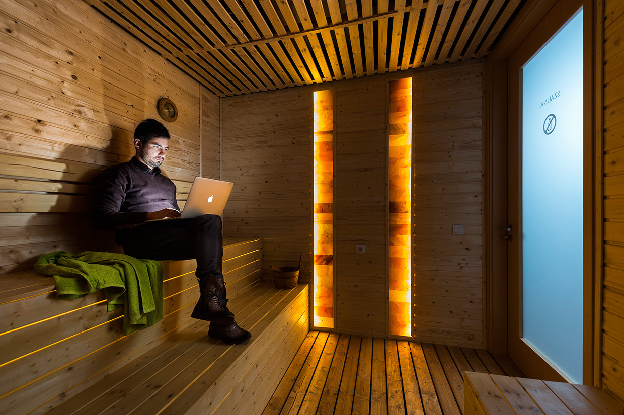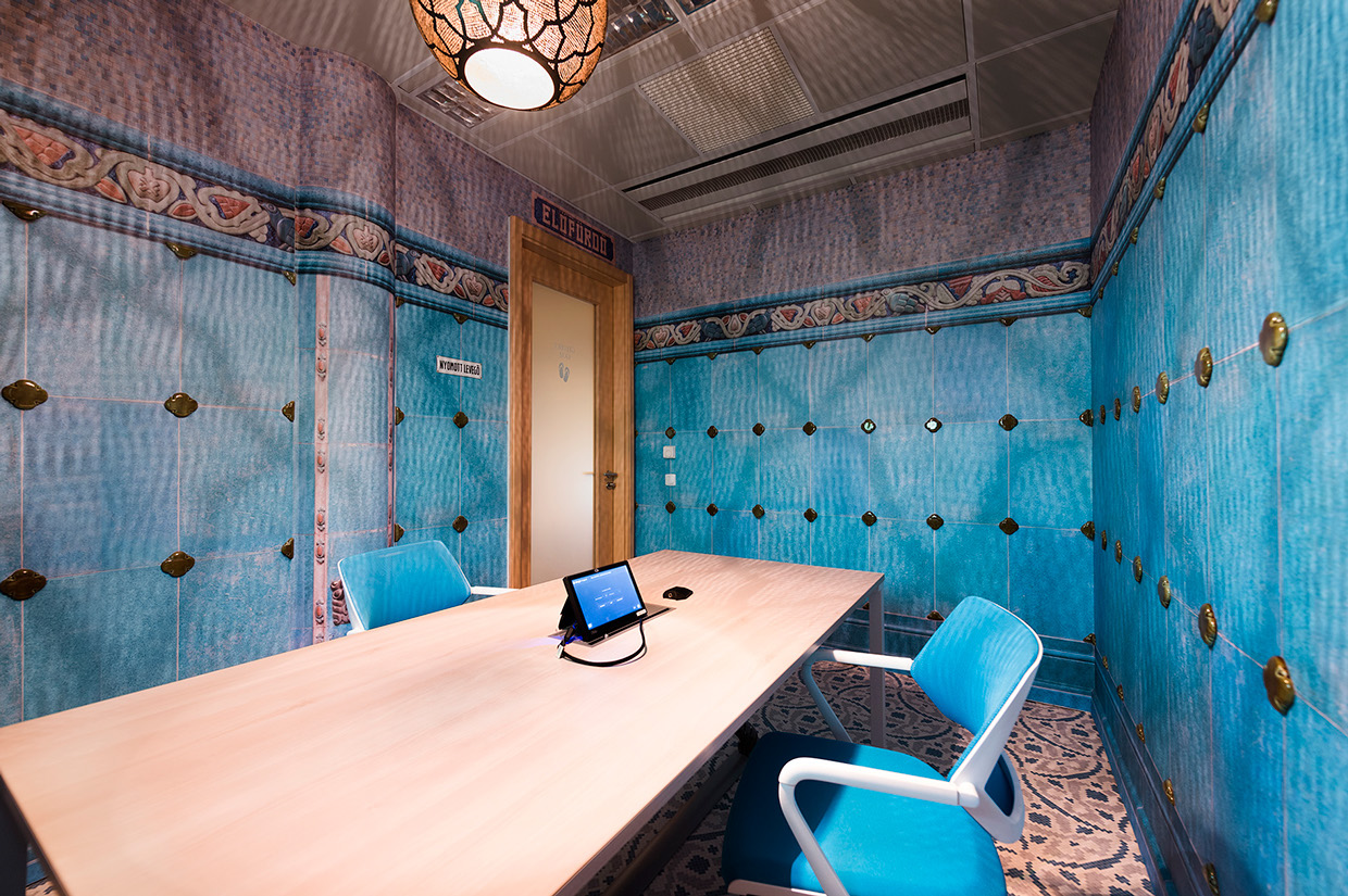 Az itteni iroda tervezésénél a kulcsszó a FÜRDŐ volt, tekintettel a magyarországi fürdőkultúra világhírére. Az egész koncepció e köré a szó köré épül, visszaköszön a falakon, a párnákon, a csempéken, a padló burkolatán, a kiegészítőkön, méghozzá nem csak átvitt értelemben, hanem itt-ott már szinte meghökkentő módon szó szerint: eszedbe jutna például laptopot vinni egy szaunába…? 🙂