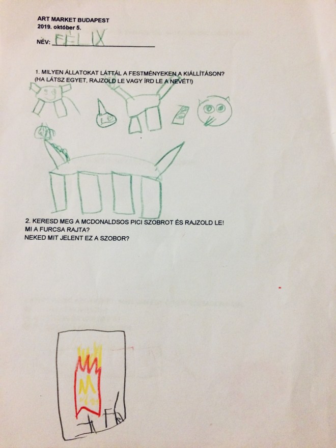 Mikor pár nappal ezelőtt teljesen felnőtt program keretében végigsétáltunk az Art Market Budapesten, eszembejutott, hogy hétvégén kijövök újra a gyerekekkel, de most először úgy, hogy előtte összeírok nekik pár kérdést, amire a válaszokat a kiállításon találják meg. Az volt a dealünk, hogy ha minden kérdést megválaszoltak, összeépíthetnek maguknak egy LEGO figurát a boltban jutalomként. Ez annyira felvillanyozta őket, hogy még engem is meglepő lelkesedéssel járták végig az egész vásárt, nagy izgalomban, hogy minden rejtvényt sikerül-e megoldaniuk. Keress állatokat, találd meg a McDonaldsos miniszobrot és a meztelen kisfiút, vagy épp rajzold le valamelyik képet, amit viccesnek találtál. A kicsi nyilván még nem tud se olvasni, se írni, ő végig csak rajzolt, a feladatokat olvasni meg én segítettem neki.