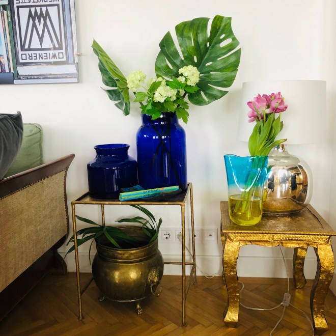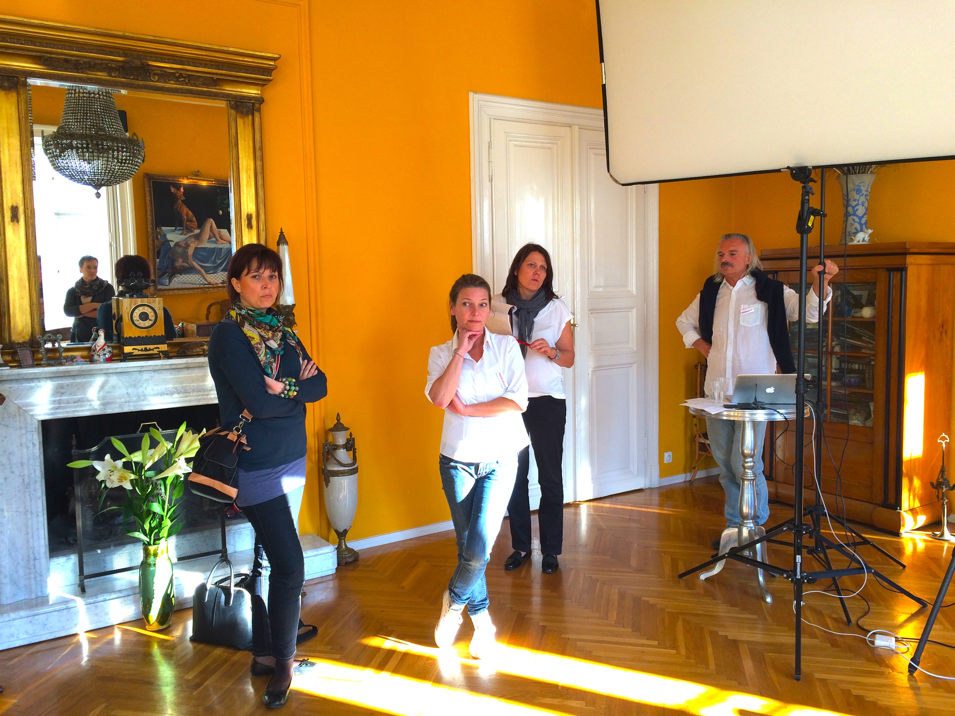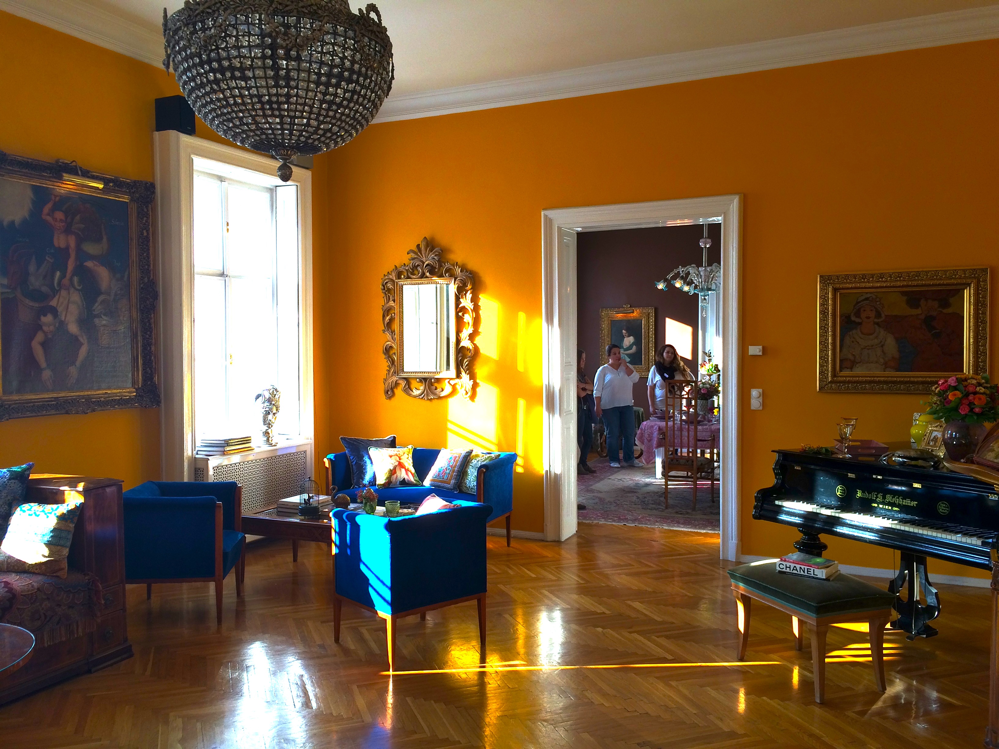 A helyszínt csak pár nappal a workshop előtt tudtuk meg, egy hatalmas, Bajcsy-Zsilinszky úti polgári lakásba kaptuk a meghívást. Egyáltalán nem az a vonal, mint amilyeneket én mutogatok itt a blogon, teljesen más stílus. Ugyanakkor vitathatatlanul izgalmas és egységes, egy saját kis külön univerzum, amit egészen biztosan nem felejt el soha, aki valaha belépett oda. Nagyon erős színek, rengeteg festmény (sokuk meghökkentő), mindenféle kisebb-nagyobb dísztárgy: ez a lakás tényleg minden érzékszervedre intenzíven hat.